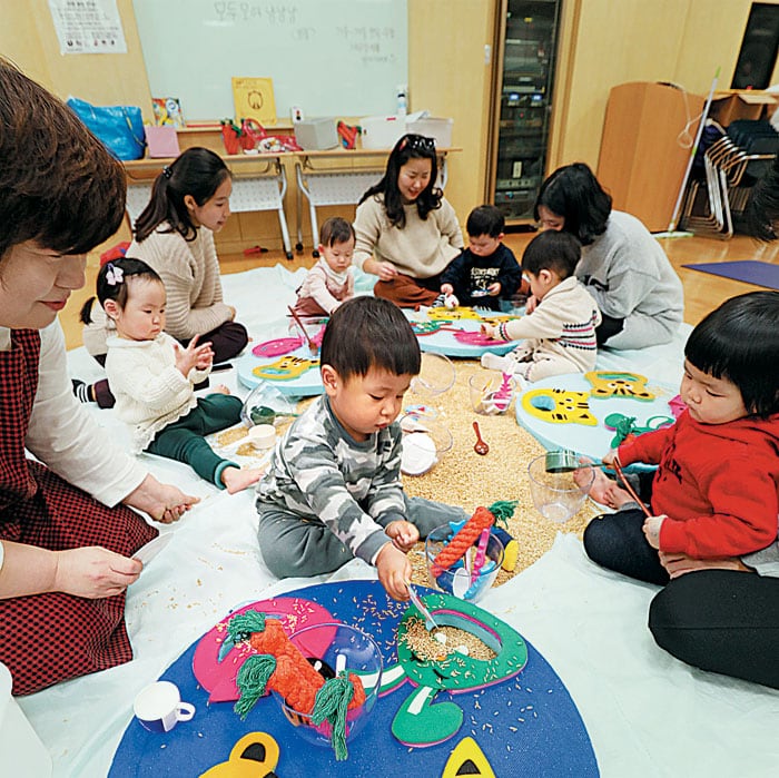 30분 정도 아기와 함께 다양한 활동을 하고, 남은 10분 동안은 간단한 대화로 마무리합니다. 매주 ‘신체, 생태, 감정, 예술’을 집중적으로 다루는 주제가 있는데 사랑이처럼 2세 미만의 아기들은 오랫동안 집중하는 능력이 부족합니다. 치고는